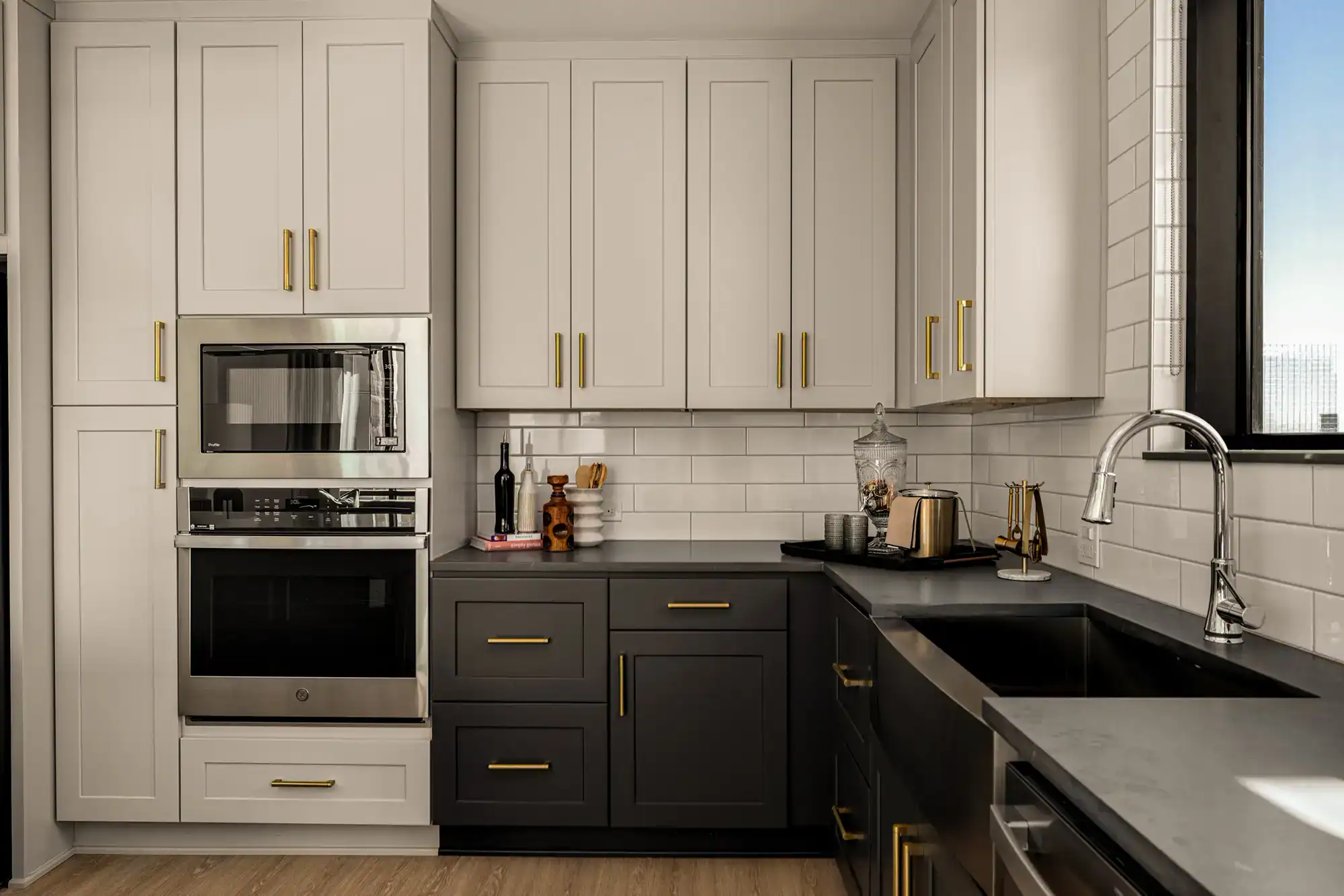 - Shaker-Style Cabinetry with Adjustable Cabinet Shelving and Expansive Storage